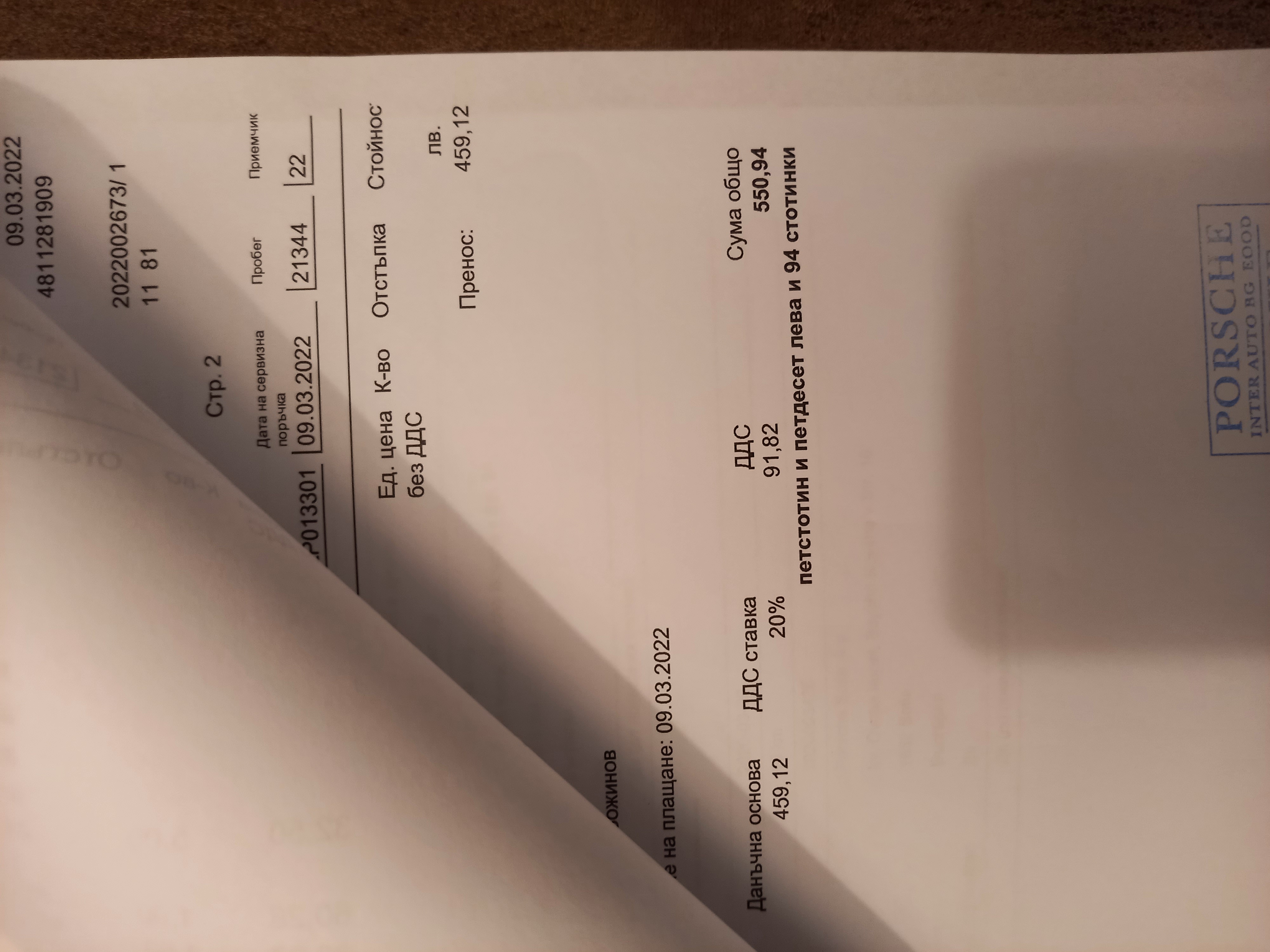 Обслужване на 21.12.2021 - 40394 км (цена без ДДС) - Смяна масло, маслен, възд ф-р; смяна спирачна течност, смяна запал. свещи. Порше Изток.