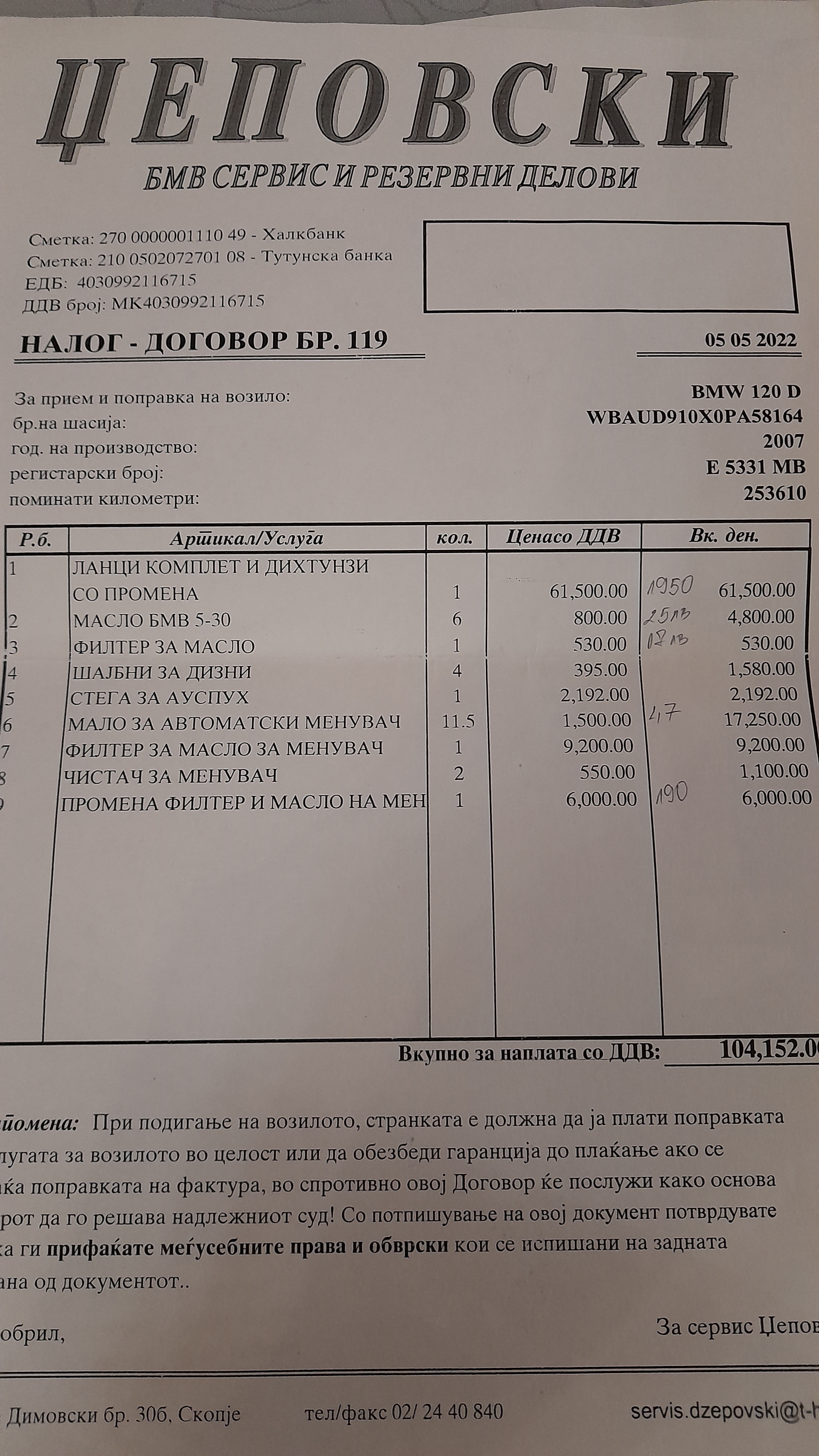 Дару кар дадоха добра цена с писмена оферта, описани всички части с парт.номера и цени, като се има в предвид че ще се вложат орг. части и консумативи но, им липсват майсторета!