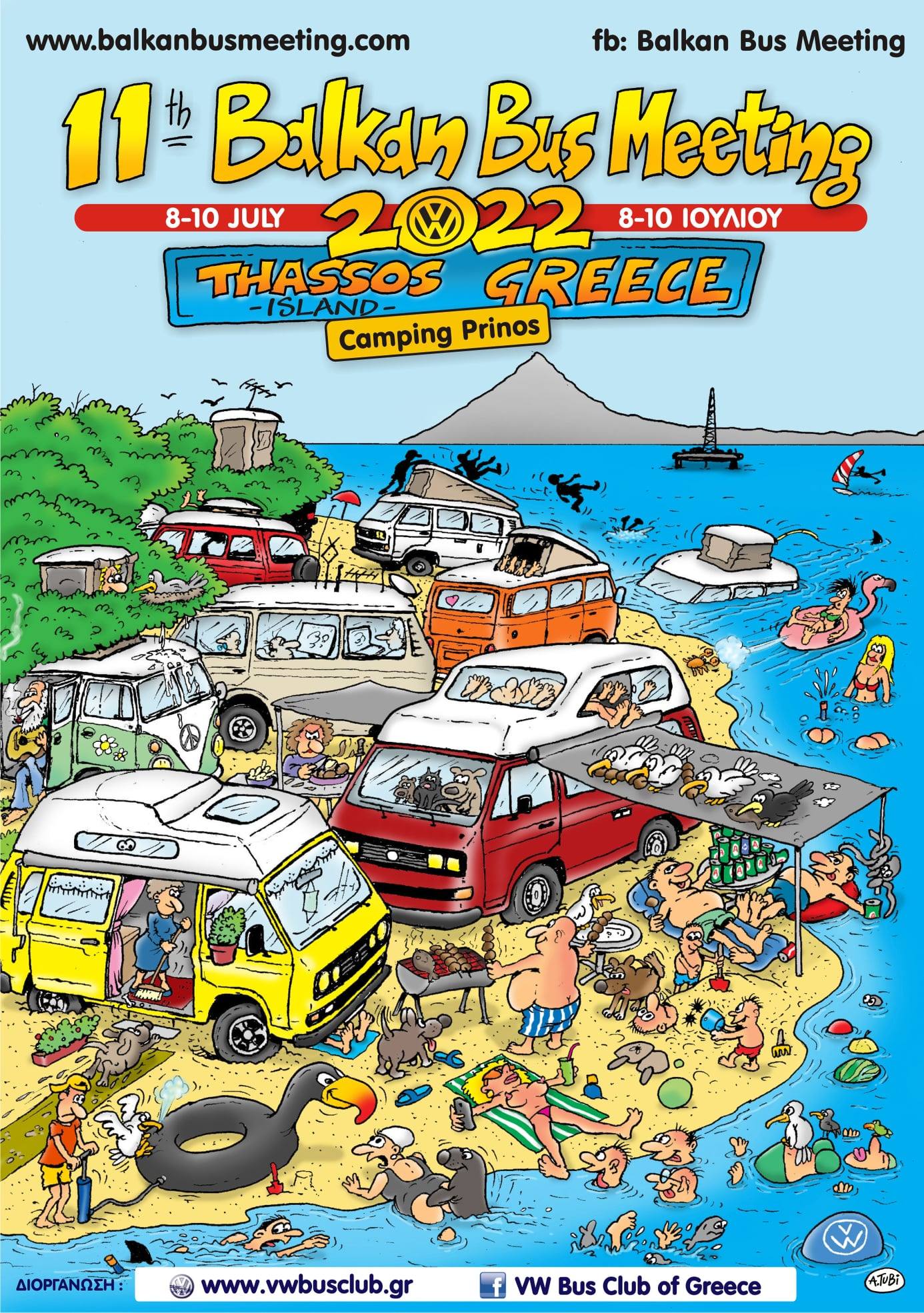 PS: Срещата ще се осъществи на голям организиран къмпинг край морето. Ще се възползваме от отстъпка 20% на цените на къмпинга. Ще има също отстъпка за превоза с кораб до острова. Очаквайте скоро допълнителна информация за програмата, цена за участие, регистрация, възможност за пребиваване на хотел или стаи под наем. Ще се спазват хигиенните мерки срещу Covid-19. Следете ни в FB Balkan Bus Meeting, VW Bus Club of Greece и http://www.balkanbusmeeting.com, http://www.vwbusclub.gr