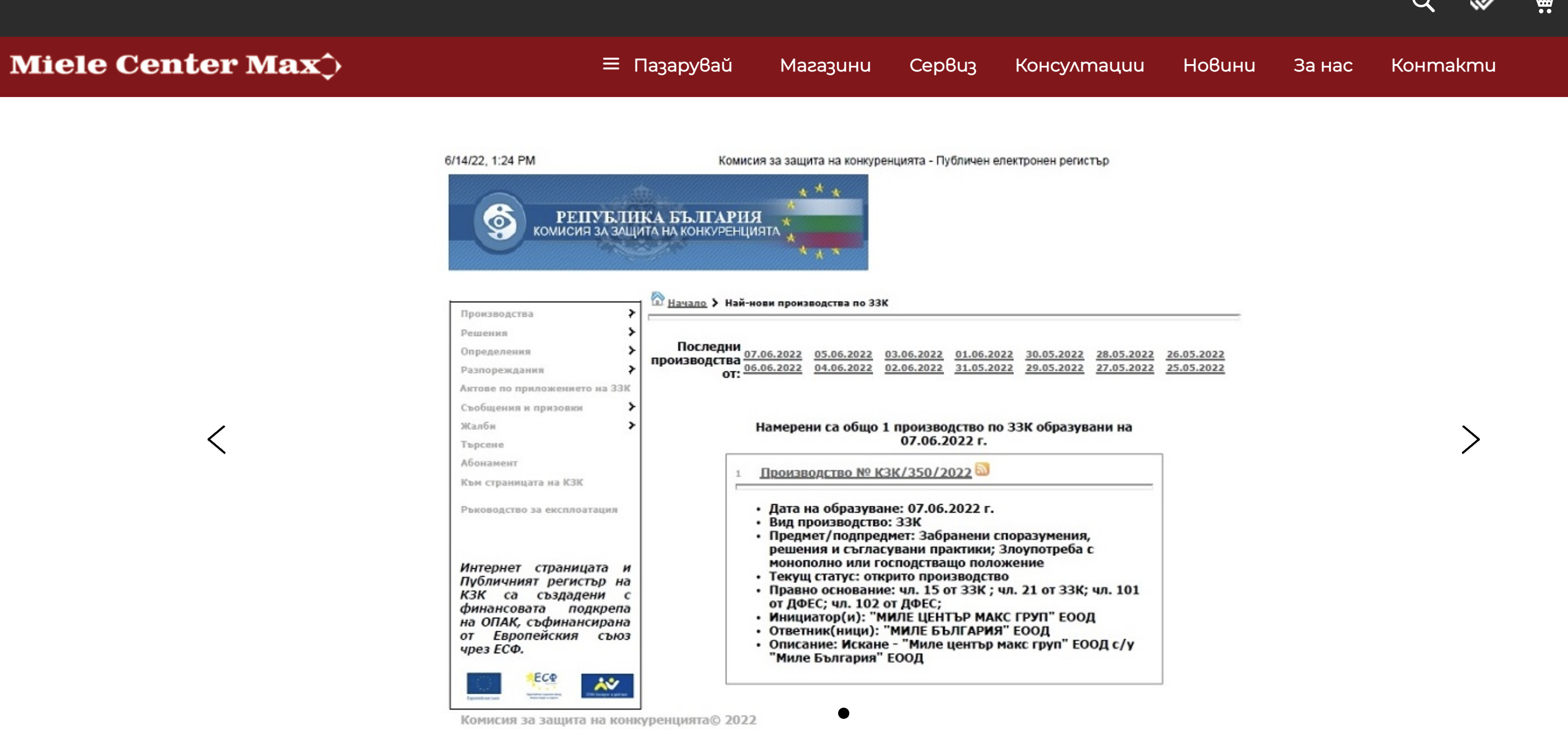 Както вече ви уведомихме, на 18.04.2022 г. „Миле България“ ЕООД едностранно ни уведоми за желанието си да прекрати съществуващите договори за дистрибуция на продукти с марката Miele с „Миле Център Макс Груп“ ЕООД , като считано от тази дата на „Миле Център Макс Груп“ ЕООД е отказано от доставчика да закупува от „Миле България“ ЕООД и доставя на клиентите си продукти с марката Miele. „Миле Център Макс Груп“ ЕООД счита, че прекратяването на съществуващите договори е извършено в нарушение на клаузите им и приложимото законодателство, като незабавно уведоми „Миле България“ ЕООД за тази своя позиция, както и предприе всички допустими правни и фактически действия за защита правата и законните си интереси, съответно правата и законните интереси на своите клиенти. За съжаление, приключването на съдебните и административни процедури зависи от съответните органи. До приключване на производствата, „Миле Център Макс Груп“ ЕООД e в обективна невъзможност да извършва доставки на продукти от марката Miele, включително заявени и предплатени от клиентите му преди 18.04.2022 г., поради неправомерния отказ на „Миле България“ ЕООД да извършва доставка на продукти съгласно условията на договорите между „Миле България“ ЕООД и „Миле Център Макс Груп“ .