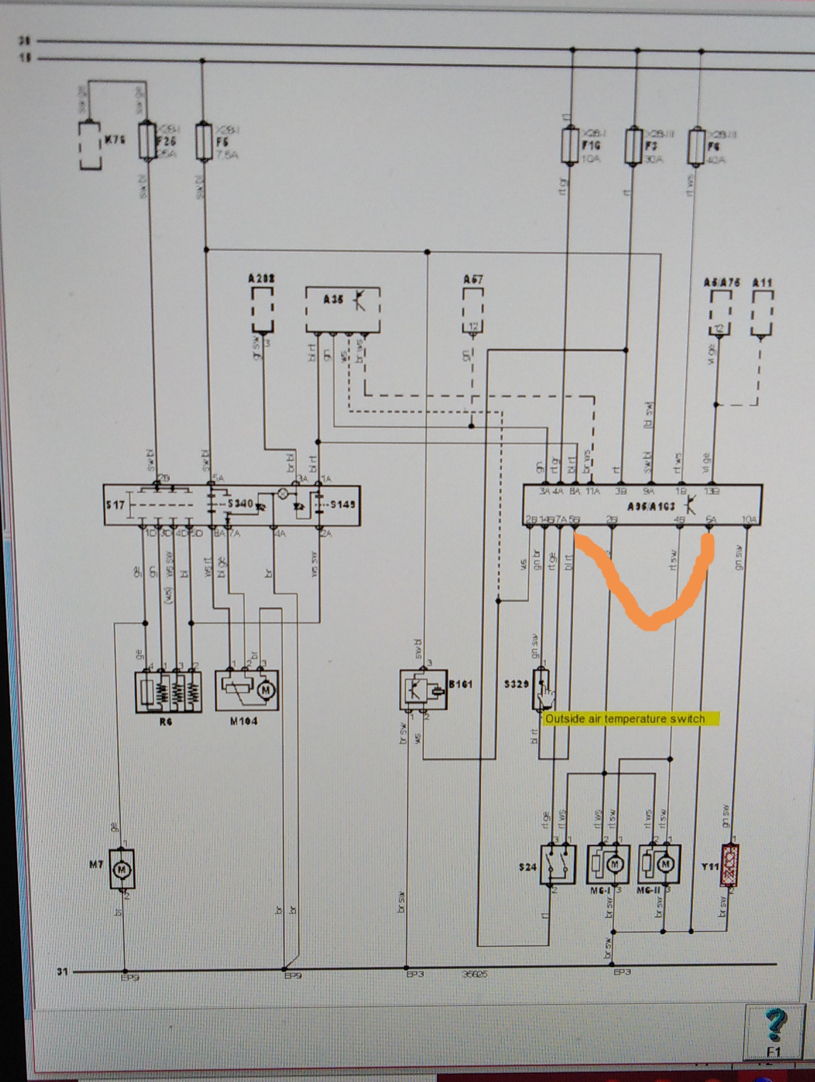 Другия кабел който е с пунктир го има и има връзка.. колата е с ръчно управление на климатика. Другото което датчика за външна темп който свързах подкората на чистачките е датчик който измерва темп размених го с този дето показва на таблотои показва точно темп. А по схема трябвада е ключ който отваря веригата при ниск темп. И до въпросния датчик стигат 4волта а мисля че трябва да са 5волта.