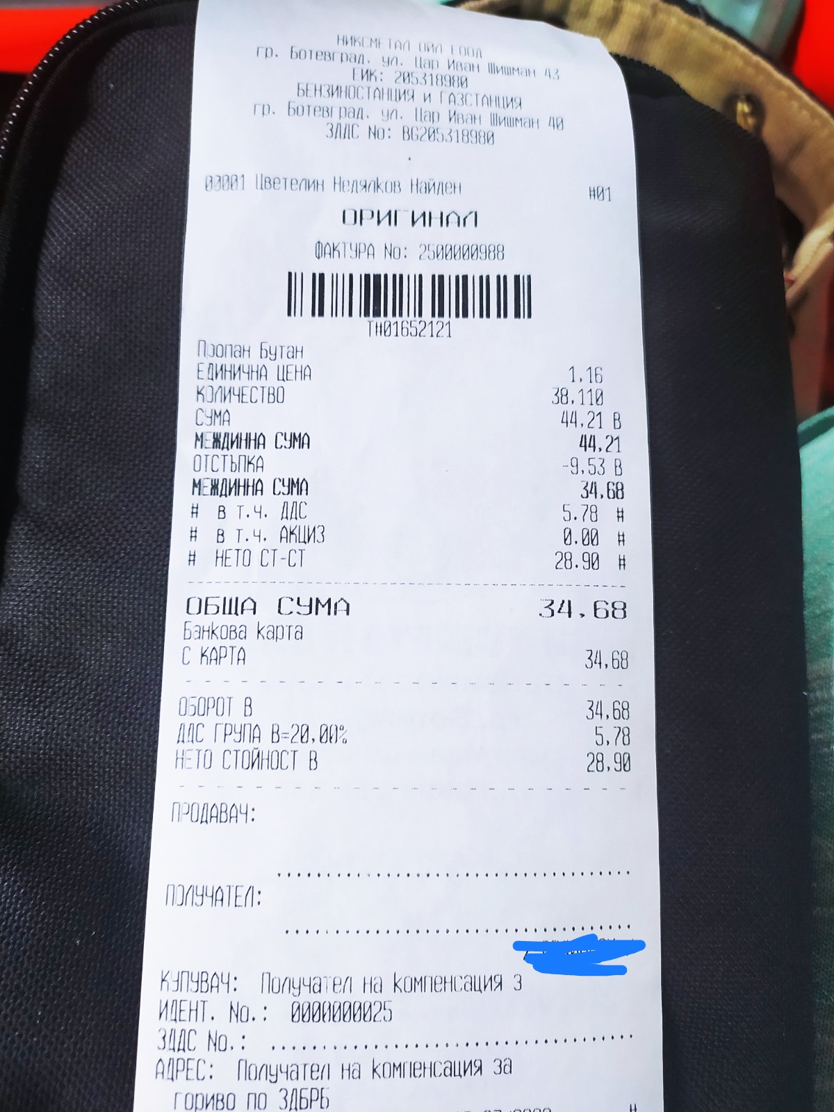 Някой има ли бележка от зареждане с LPG/CNG? Срещу акциз и ДДС какво пише там?