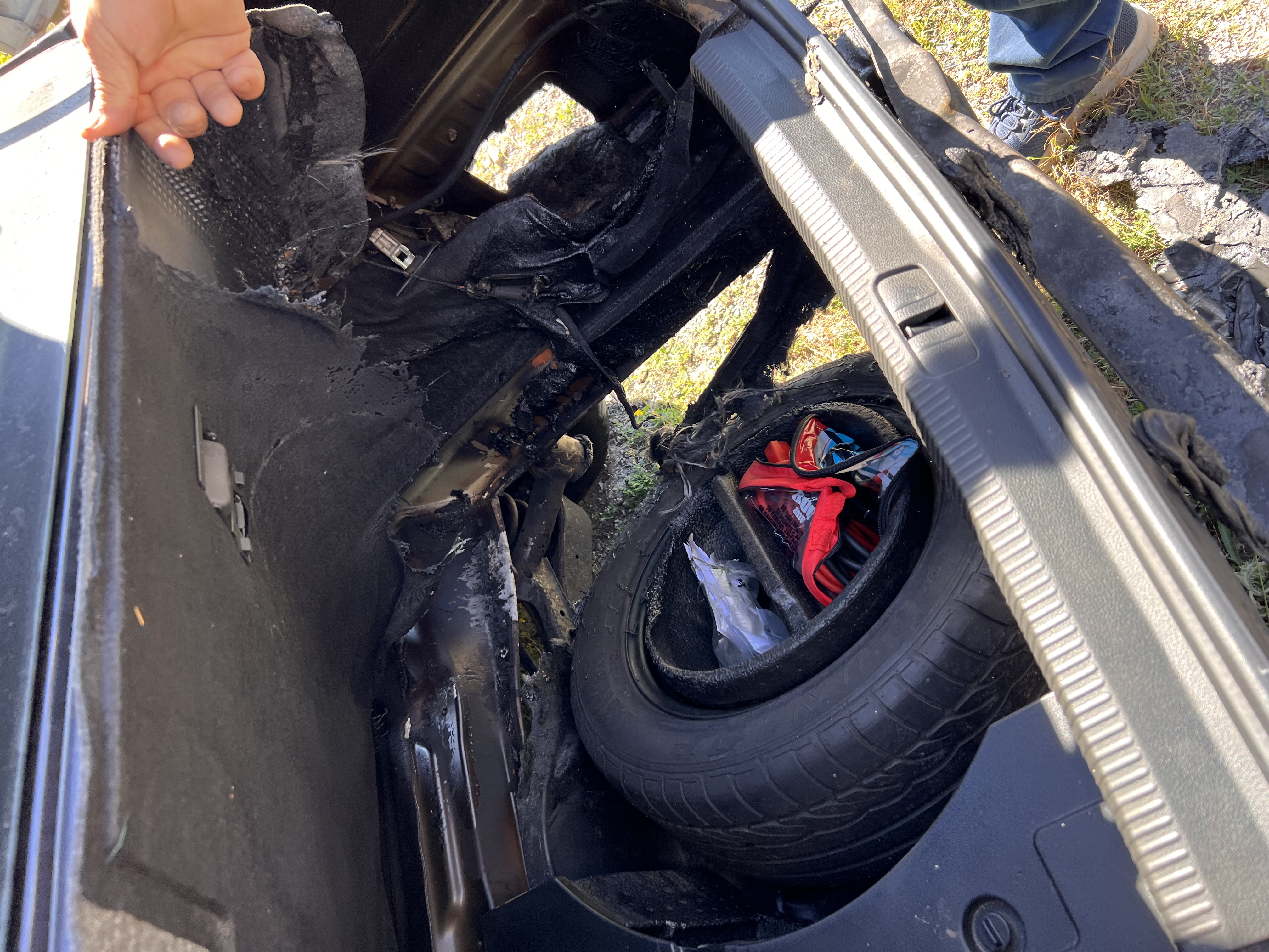 Огъня е в багажното отделение в дясната част на колата. Не е засегнал седалките, което е добре. Реално основните поражения са в дясната част, като там пода е стопен, както и съответно цялата задна броня.