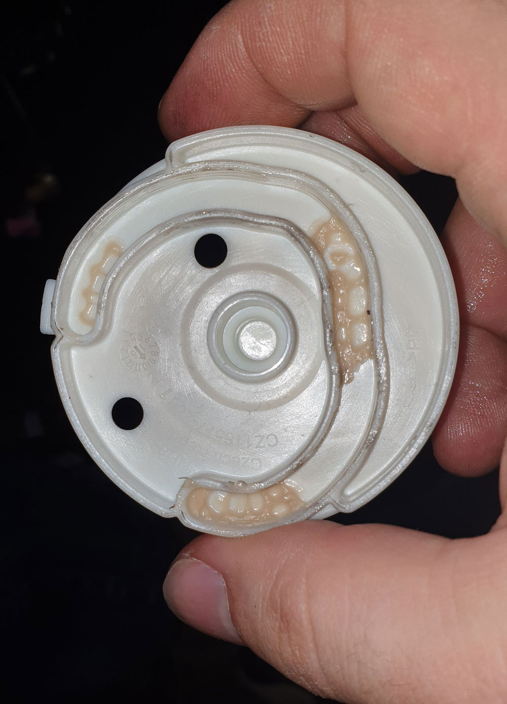 Тази пролет забелязах, че клапата за въздушния поток, която отваря за изсушаване на предното стъкло не работи и при дъжд не можеше да се изсуши добре предното стъкло. Свалих жабката и моторчето (5Q0907511A), което я върти, но моторчето си работеше. Свалих и пластмасовата част (като кръг с канали), която върти моторчето, но не видях нищо счупено или износено. При движение с ръка, сякаш не вървече много гладко и на места искаше малко повече усилие да бъде завъртяно.