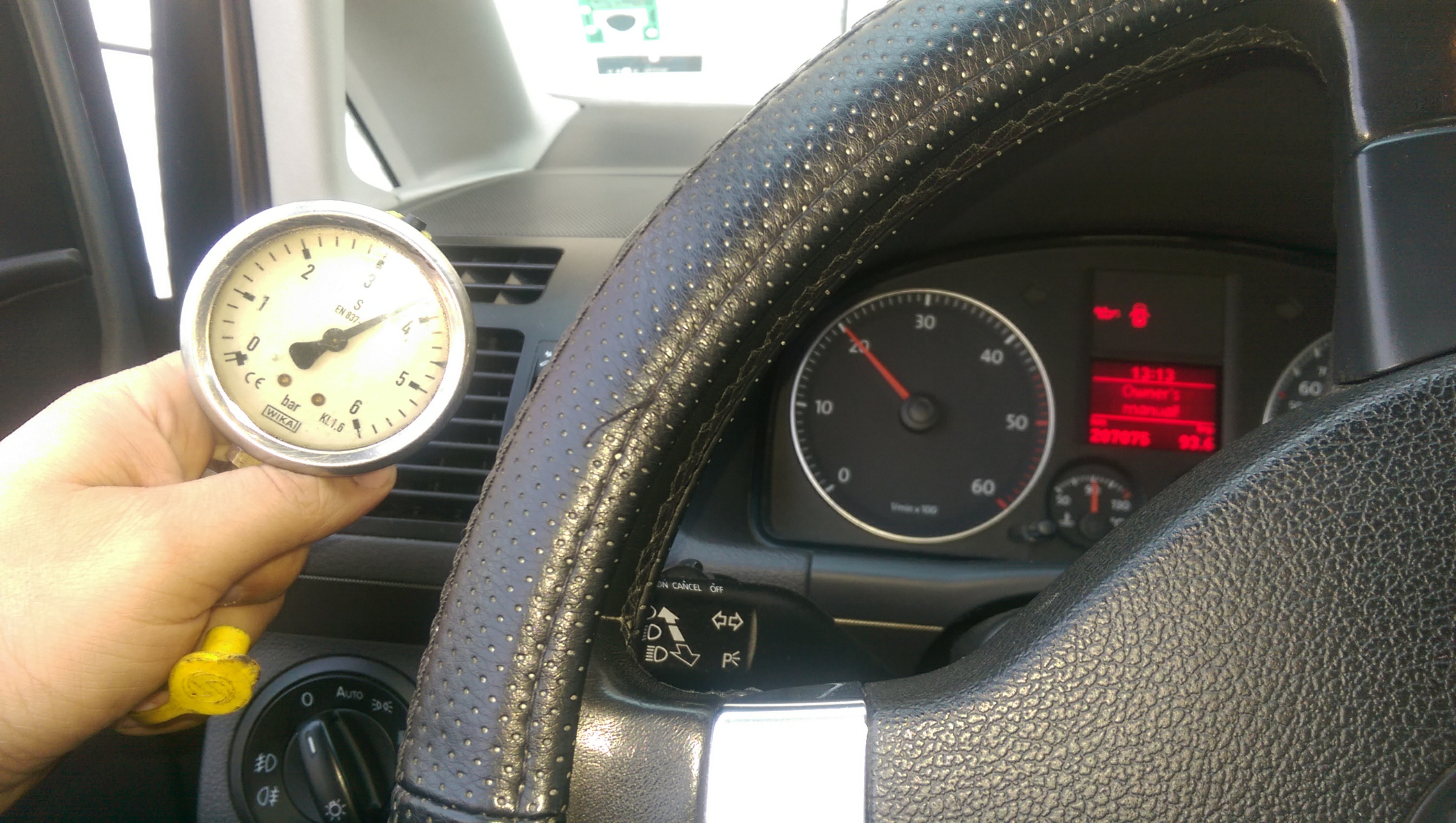 Здравейте колеги, колата ми е ФВ Туран 2008-а година купувана нова от България на 206 000 км. При нормално ускорение и превключване от 2-а на 3-а предавка на около 2500 оборота внезапно ми светна на таблото надпис STOP, oil pressure low, engine off, owner's manual съпровпдено със звуков сигнал. Прверих нивото на маслото и си беше на средата на щеката. При запалване надписа изчезва и на около 1500 оборота се появява пак. Остаавих колата на майстор и след два дни ми я върна в същото положение и каза, че проблема най-вероятно ми е в таблото, колата си вдигала нормално налягане и механично всичко и е наред. Закачил и е механичен манометър на мястото на датчика и при загрял морор на обороти без газ около 800 отчита 1.6 bara. На 2000 оборота 3.7 bara. Сменил ми е датчика за ниско налягане на, който пише 0.5-0.85 bara. Свалял е картер, за да види дали нямало някакво парче да застава на цедката, но всичко било наред. Твъди, че нямала втори датчик за високо налягане (намиращ се на главата например). Преди около месец ми сменяха масло, маслен и въздушен филтри, нарязаха ми по-голяма резба за нова пробка, понеже старата превъртя. За да изключа варианта маслен филтър вчера го смених, но прпблема продължава.Сега мисля да сменя и маслото с ново, за да изключа и него като вариант понеже това са нещата които са правени последно по колата. Ако някой е имал подобен проблем или знае какво може да е моля да каже. Качвам и снимки с манометъра.