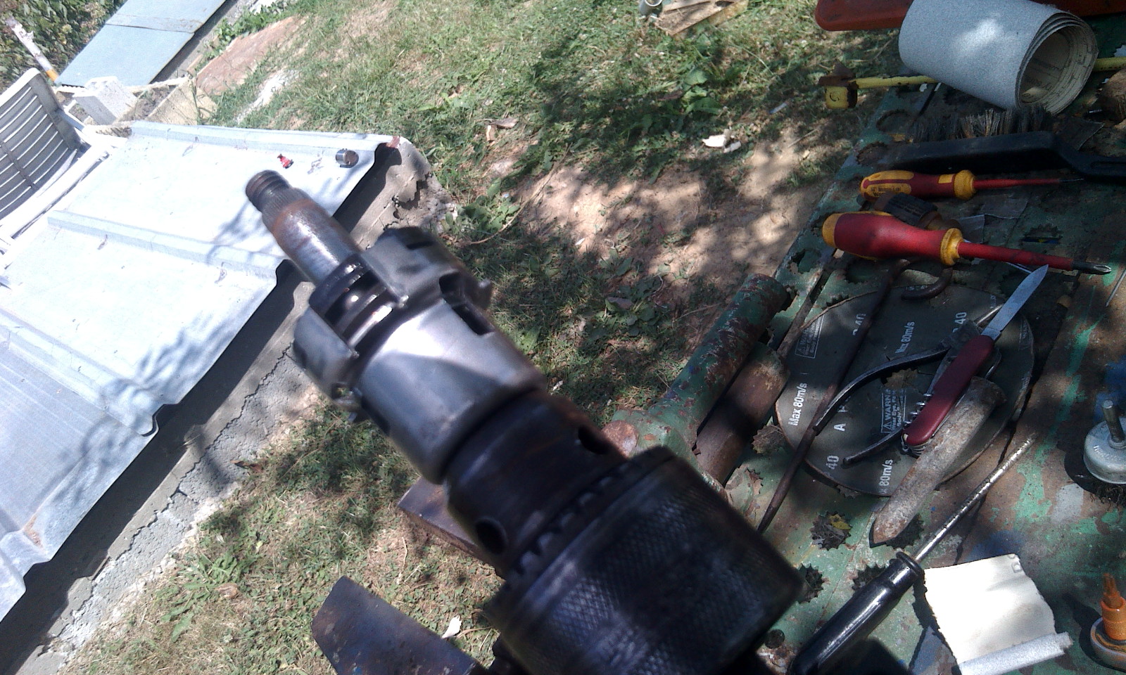 След демонтажа на елементите се "натиква" вътрешната част на спирачният механизъм във дрелка или винтовер и заръждавялата ос се запознава със шкурката :11 до приемлив вид.