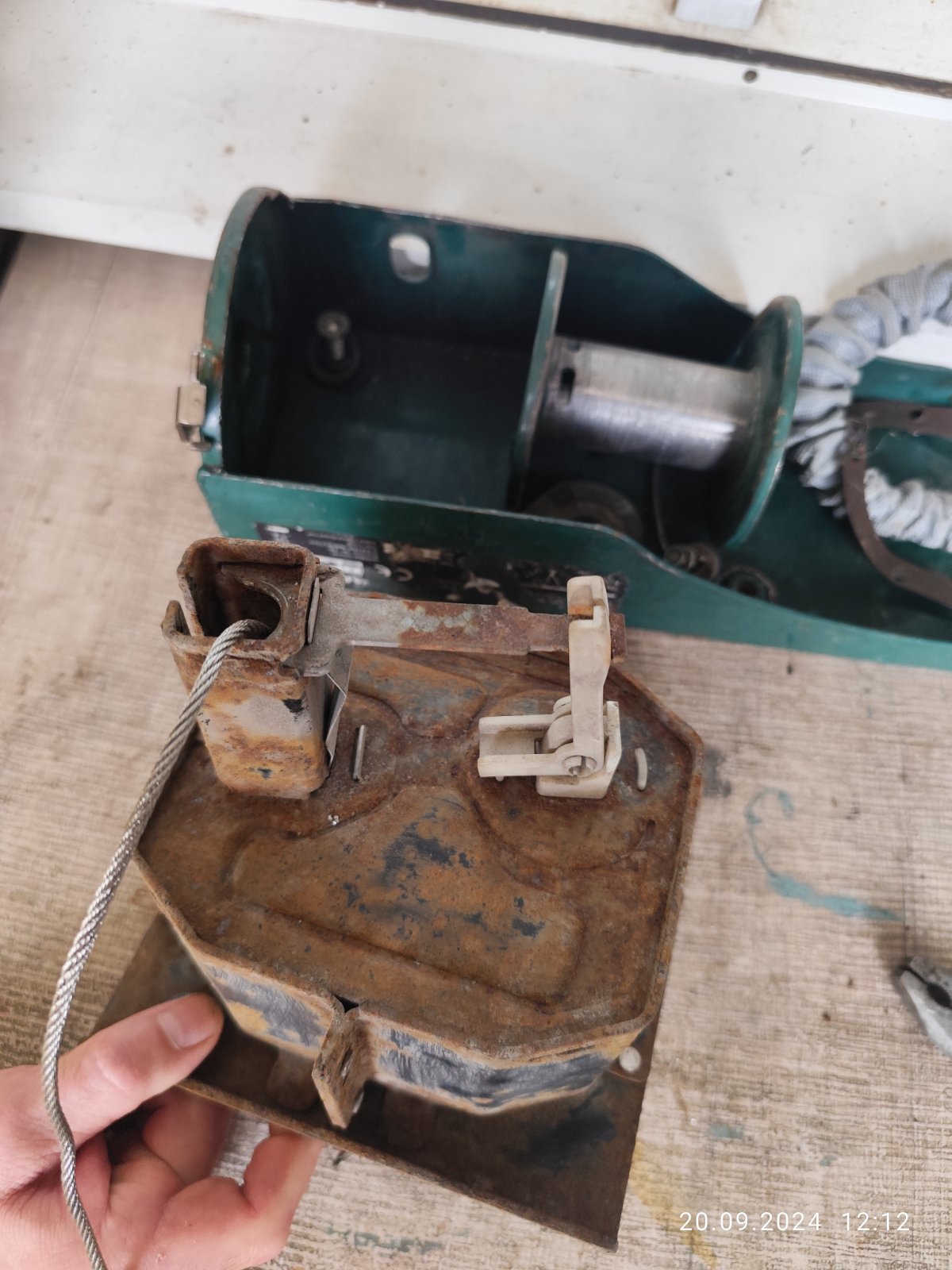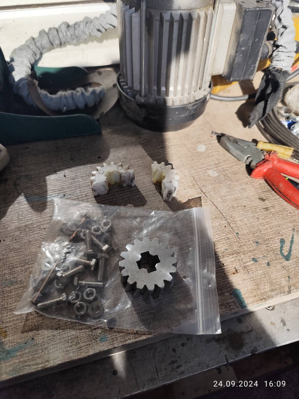 След една спукана гума(сцепена буквално) бедата не дойде сама, при прибиране на р. гума се прецака и лебедката. За 8-9 години да съм я ползвал 3-4 пъти. Разтърсих се и за втора употреба лебедка от 100 и нагоре лева, не ми се даваха парите, при положение че не се знае кво им е дереджето. Знаех за проблема отдавна и бях намерил онлайх ремонтни комплекти за пластмасовото зъбно колело в Германия, но се оказа че вече се предлагат и в Бг- най ниската оферта спечели 45лв с 5 лв доставка. Пратиха го(алуминиево) с комплект неръждавейка болтове м6 и свредло 6мм. Със свредлото се разпробиват стоманените нитове с които е капсулована лебедката. Другото е ясно от снимките. Колелото пасна като млад зет до баба си.
