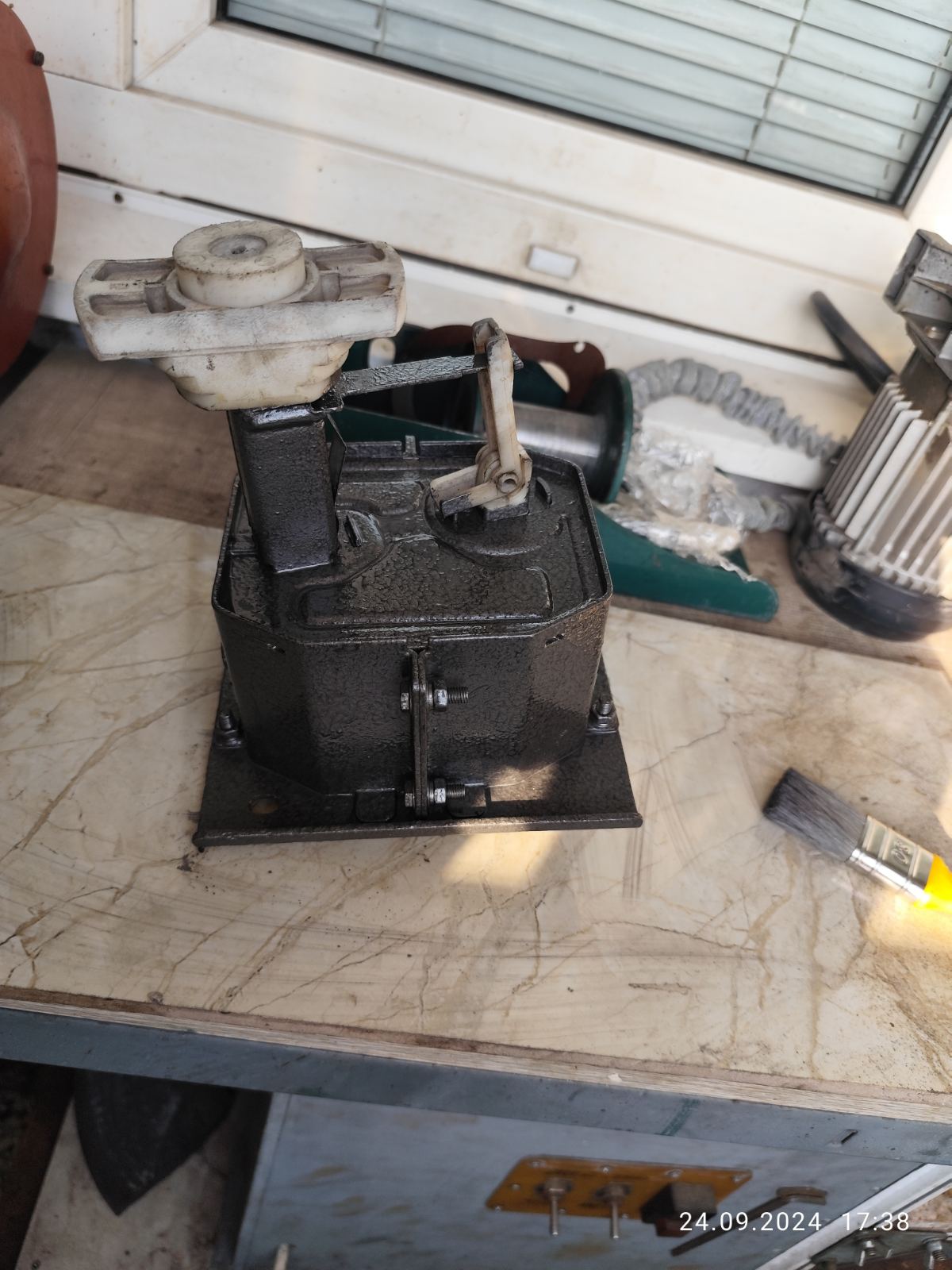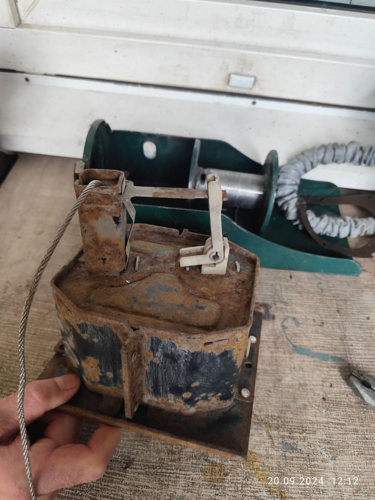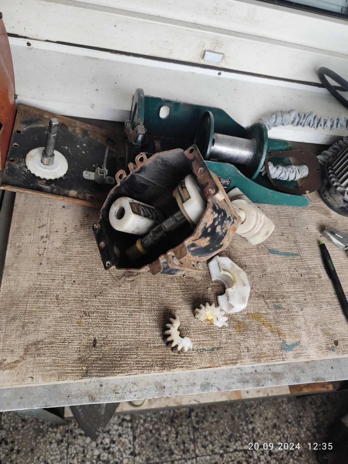 След една спукана гума(сцепена буквално) бедата не дойде сама, при прибиране на р. гума се прецака и лебедката. За 8-9 години да съм я ползвал 3-4 пъти. Разтърсих се и за втора употреба лебедка от 100 и нагоре лева, не ми се даваха парите, при положение че не се знае кво им е дереджето. Знаех за проблема отдавна и бях намерил онлайх ремонтни комплекти за пластмасовото зъбно колело в Германия, но се оказа че вече се предлагат и в Бг- най ниската оферта спечели 45лв с 5 лв доставка. Пратиха го(алуминиево) с комплект неръждавейка болтове м6 и свредло 6мм. Със свредлото се разпробиват стоманените нитове с които е капсулована лебедката. Другото е ясно от снимките. Колелото пасна като млад зет до баба си.