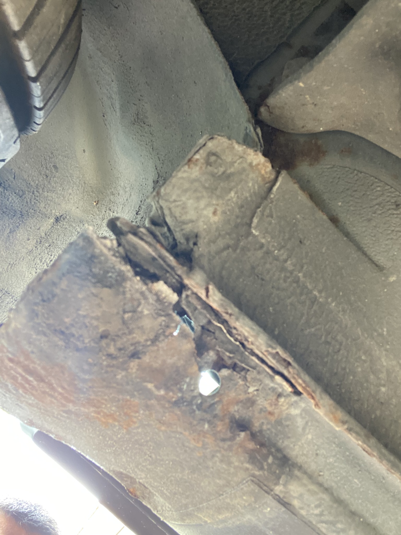 Знаете как в един момент вратичките на капачките за резервоара, започват да не се затварят плътно. Реших, че сега е момента да се захвана с тоя косур... Свалих резервоара... И там леш... Дупка в подкалника към багажника, бяха се отделили ботуша и подкалника от заварките, направо виждах как макферсона барабар с целия амортисьор се забиват в тавана на колата като по клиповете в нета...