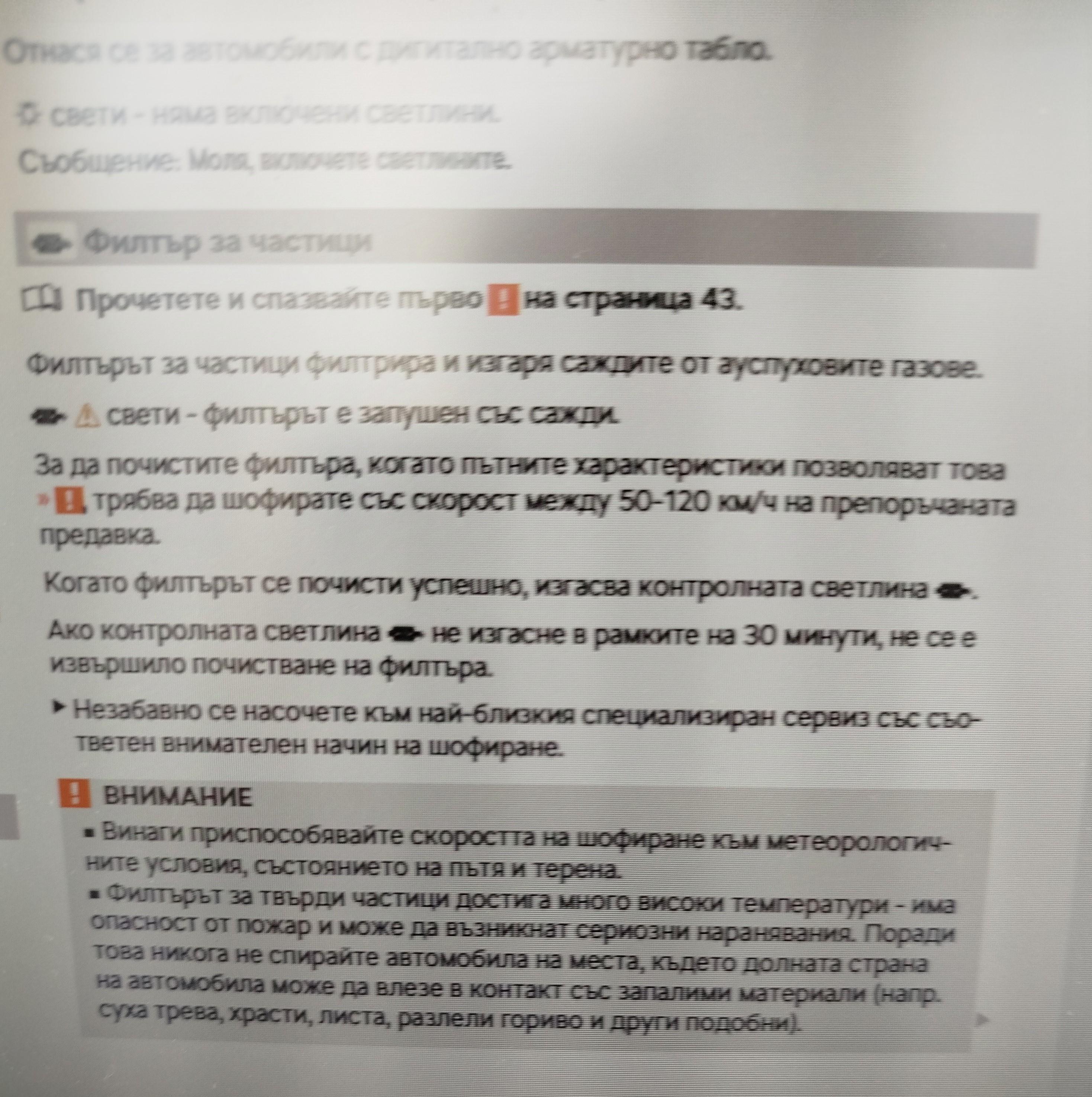 Илиян И. 79 написа:Но има препоръка-светне ли предупредителната лампа за запълнен филтър, сваляш предавка и държиш постоянно над 2400 об./мин.
