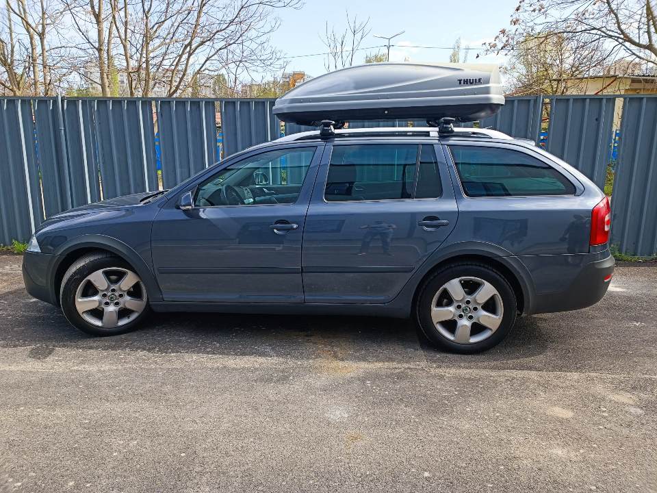 Skoda Superb 2 подготвена за стойка за два електрически велосипеда.