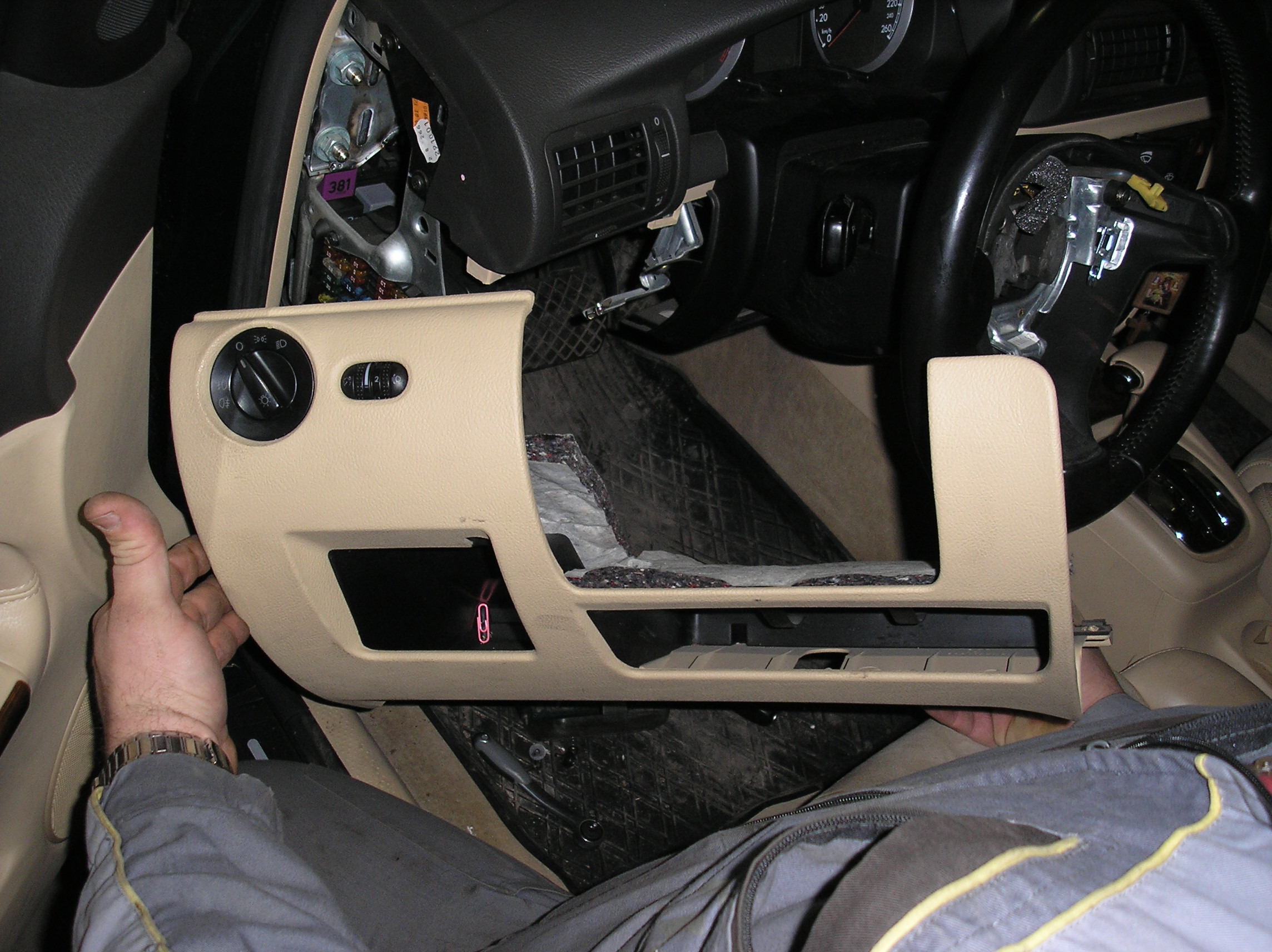 4. Свалят се корите под волана, където са бушоните и окабеляването между тях и конзолата, в която се включва компютъра. Първо се маха капака на бушоните, но той не е показан, мисля повечето знаят как става това.