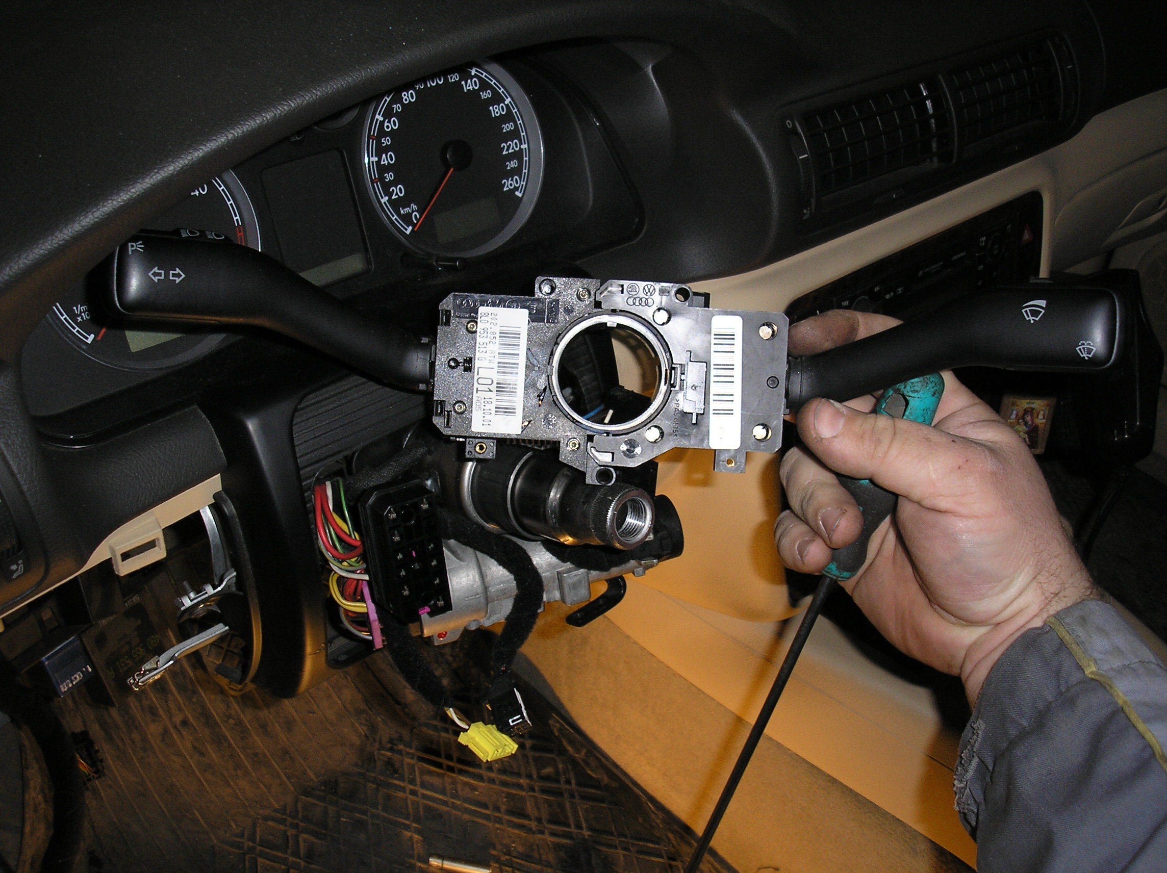5. Свалят се двете кори, които се намират около контактния ключ и лостчетата за мигачите и чистачките, сваля се и пластмасовата дръжка на лостчето за регулиране на волана.