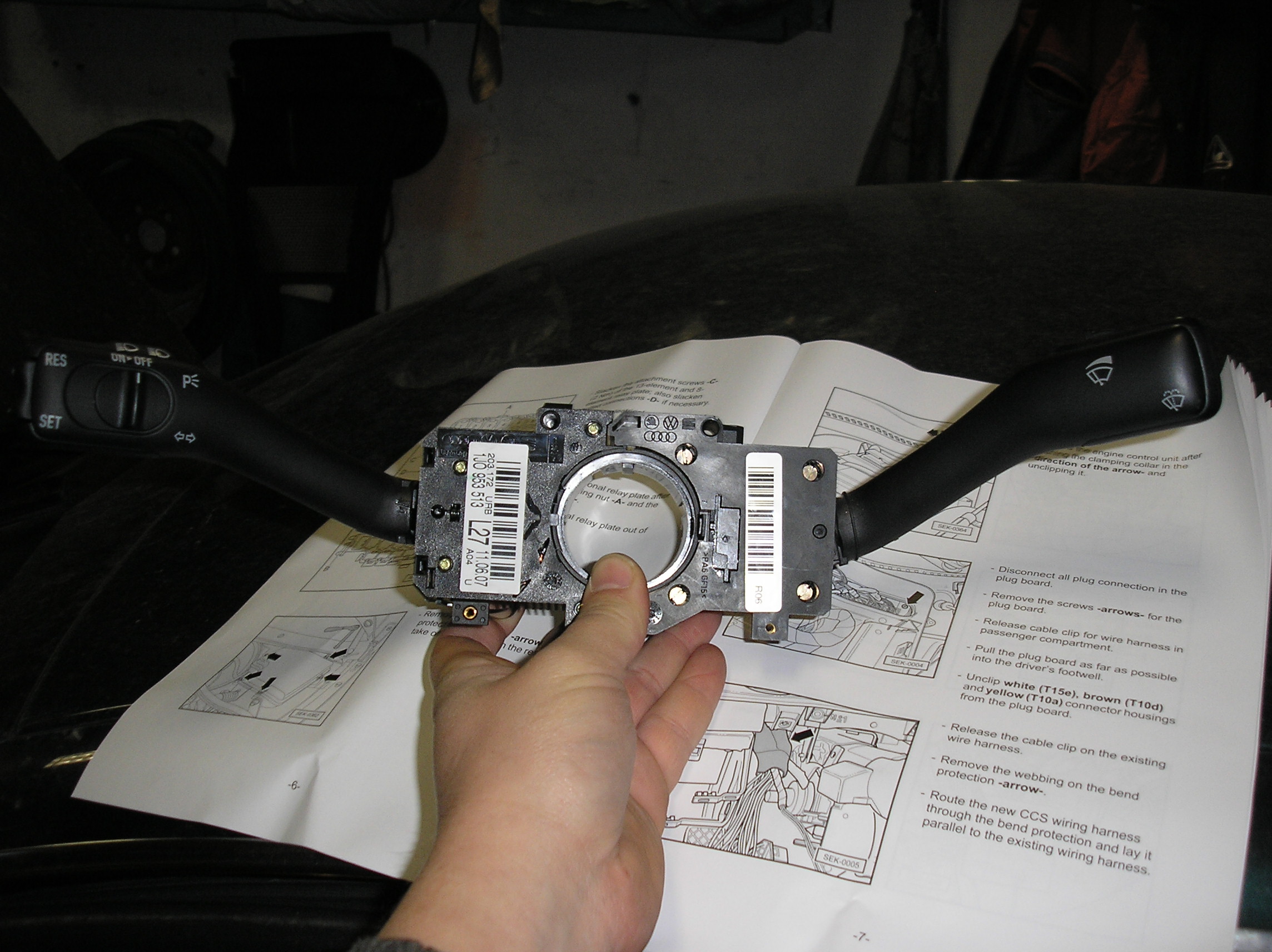 9. Чрез щифтовете, които свързват двата модула - за мигачите и за чистачките, се освобождават един от други и с плъзгане се разделят, като на мястото на старото лостче за мигачите, се поставя новото лостче с бутоните за управление на темпомата.