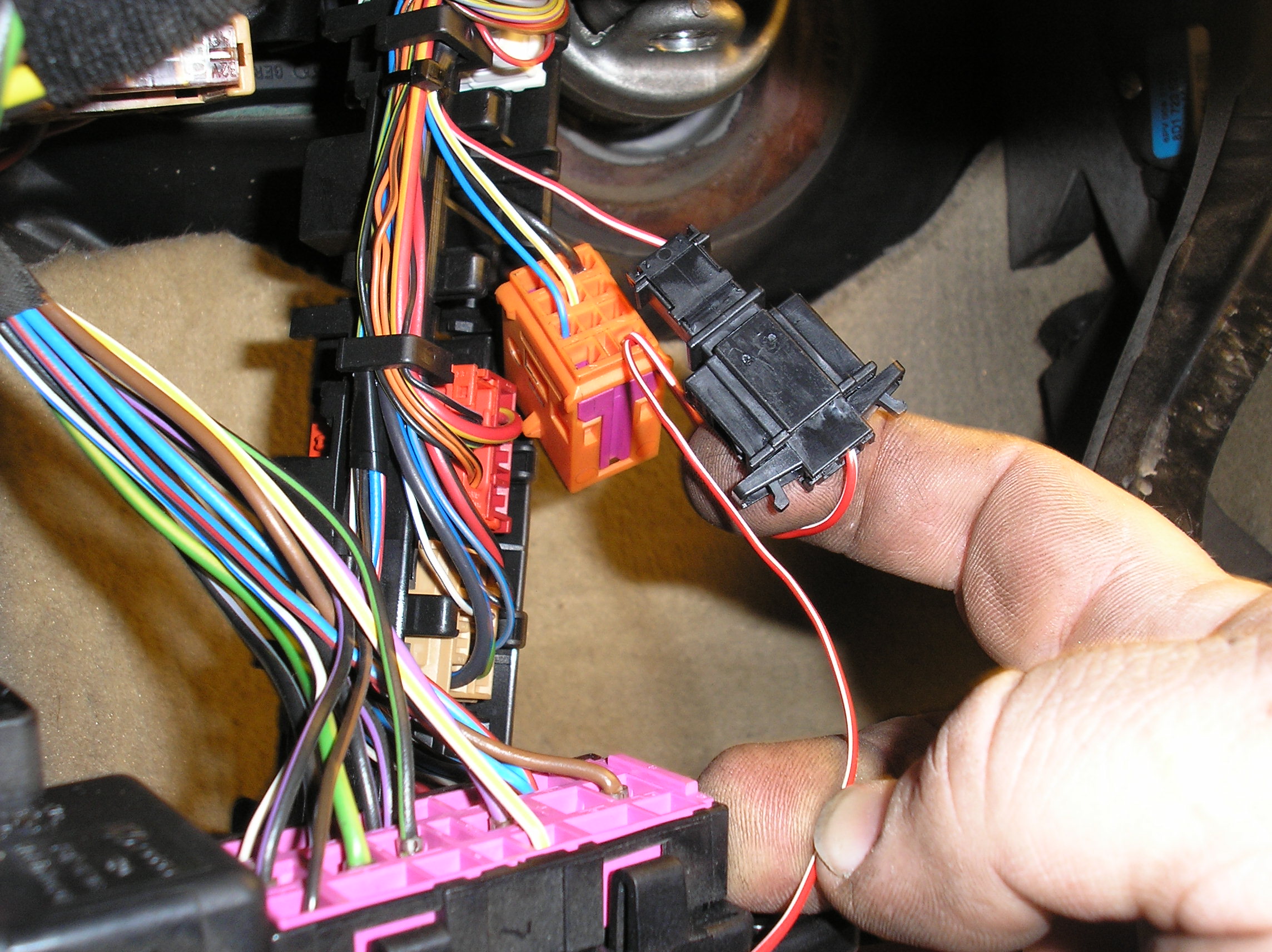 13. Посредством инструмент, направен от vaskoto1, се отваря оранжевата букса, и в нея се поставя захранващия кабел от комплекта кабели, които вървят с новото лостче за мигачите. Същия инструмент си използва и за отваряне на бялата букса, в която се поставят комуникационните кабели към компютъра, общо четири на брой.