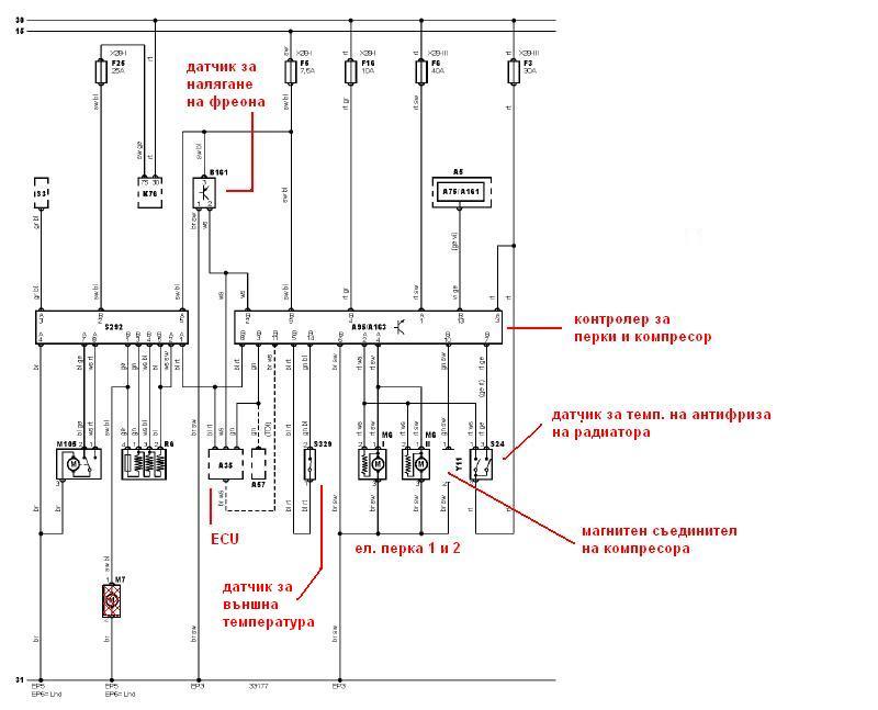 Ето и ел. схема на прост климатик след 05.99-та като вкарах малко разяснения кое квадратче какво е всъщност (измъкната е от Аутодата 2009,ако някой иска да я разглежда цялата подробно):