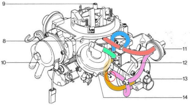 Намира се отдясно на нагревателчето, което е отдясно на ускорителната клапа. Оригинално беше залепено цилиндрично гумено филтърче от порест материал. Моля, ако някой може да даде разяснения за какво служи тази тръбичка. Това, което знам вече със сигурност от многото литература в нета е, че не е свързано с вакуума.