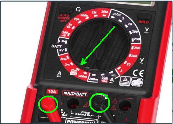 А. Измерване на обща утечка: след като загасите автомобила заключете с дистанционното и изчакайте най-малко 2 часа (вж бюлетина на VW по-горе, стр. 2) като преди това „излъжете“ алармата, че шофьорската врата и предния капак са затворени (бутнете щифта с отвертка, за всеки автомобил е различно, така че е добре да се поинтересувате как точно става за вашия). След това настройте мултицета да измерва ампераж (10 А) и поставете сондите му на правилните гнезда, както е показано на по-долната картинка.